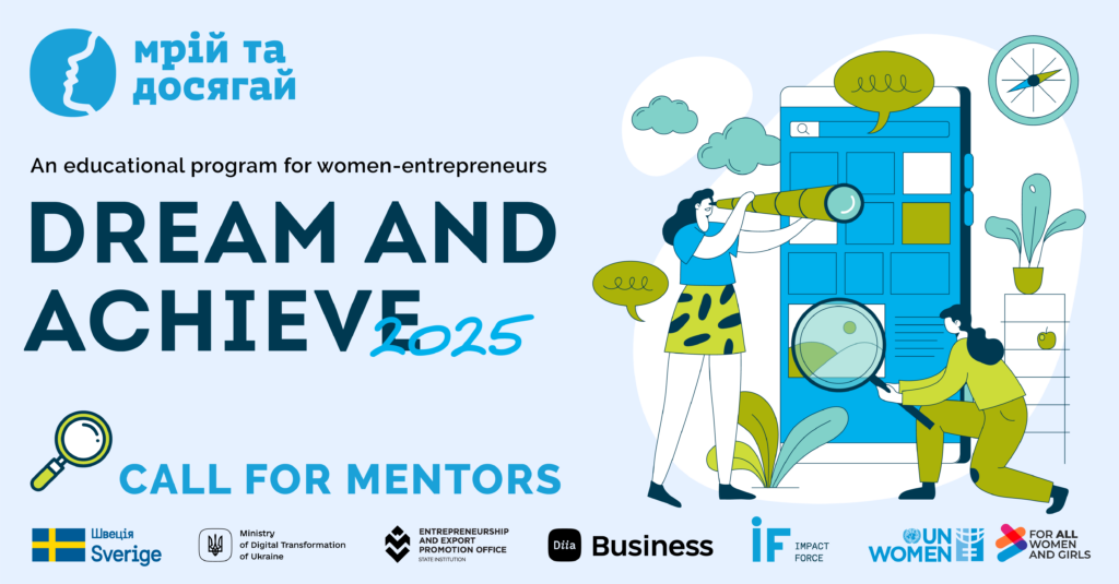 The “Dream & Achieve” program is now accepting applications from experienced entrepreneurs and professionals in business, e-commerce, and digital marketing who are ready to become mentors to talented Ukrainian women. The program supports women in starting or growing their online businesses and expanding into new markets. This initiative is aimed at empowering women affected by the full-scale invasion to realize their entrepreneurial dreams.