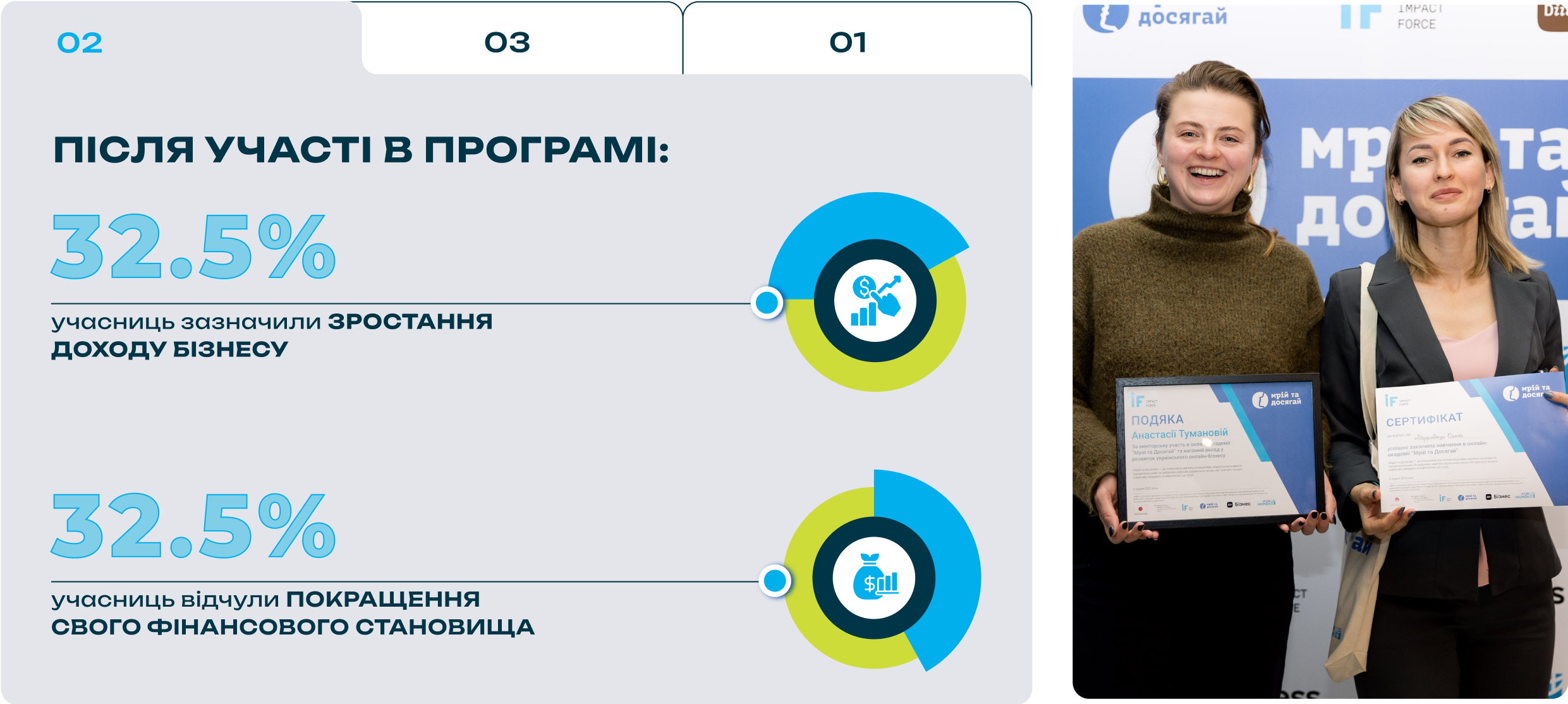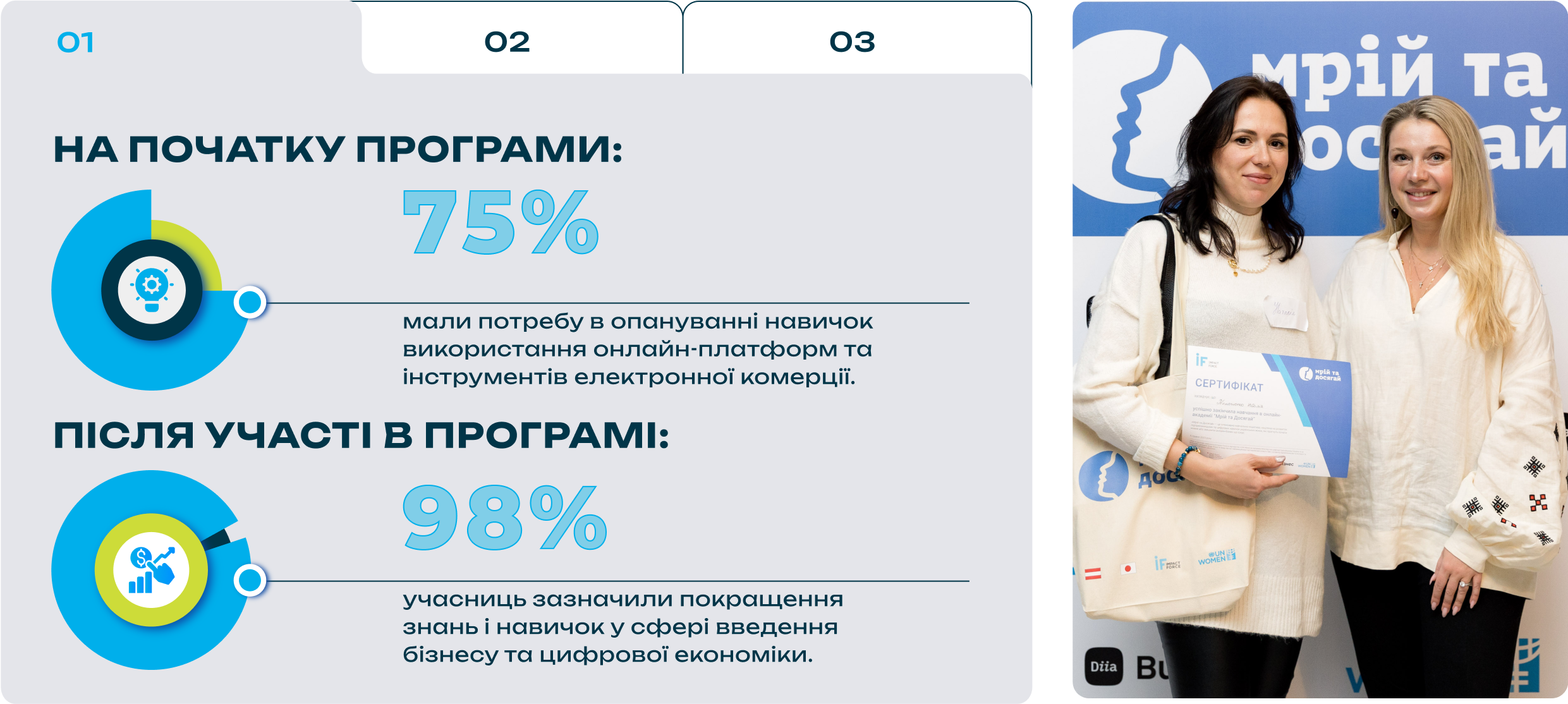У пілотній програмі 2023 року понад 1500 жінок пройшли навчання, а 80 фіналісток долучились до розширеної навчальної програми, менторської підтримки та отримали фінансову підтримку для бізнесу.