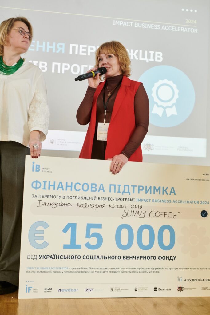 «Ця програма дала потужний поштовх для розвитку нашої інклюзивної кав’ярні. Завдяки гранту ми зможемо придбати нове обладнання, відкрити додаткову локацію та створити ще більше можливостей для соціально-побутової адаптації людей з особливими потребами. Ми прагнемо зробити “Sunny coffee” національною мережею, яка доведе, що бізнес може бути не тільки прибутковим, але й соціальним. Участь в Impact Business Accelerator була для нас незабутнім досвідом. Ми отримали не тільки фінансову підтримку, але й цінні знання та навички, які допоможуть нам розвивати наш бізнес», – підкреслила Людмила Наумець, керівник інклюзивної кав’ярні “Sunny Coffee”.